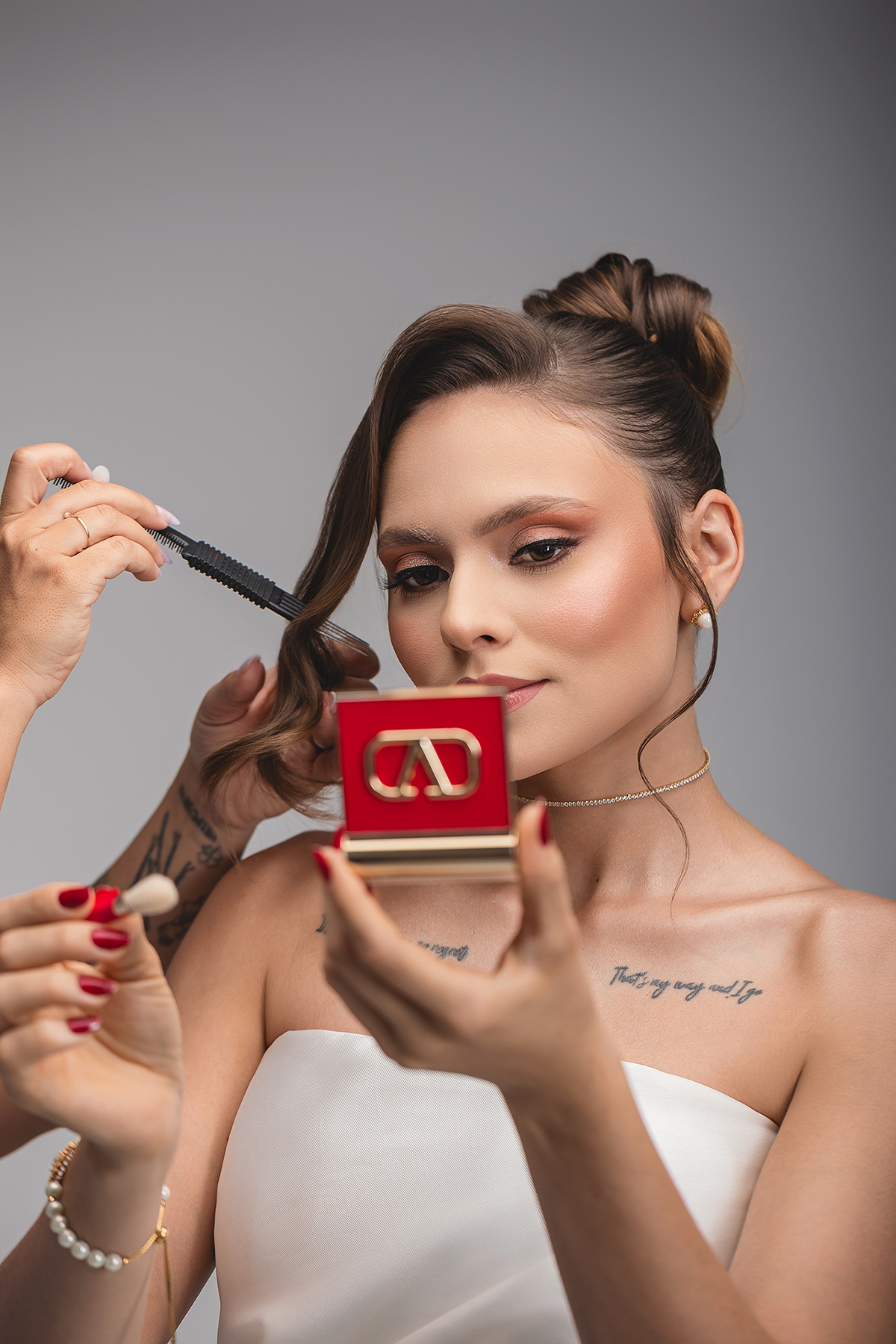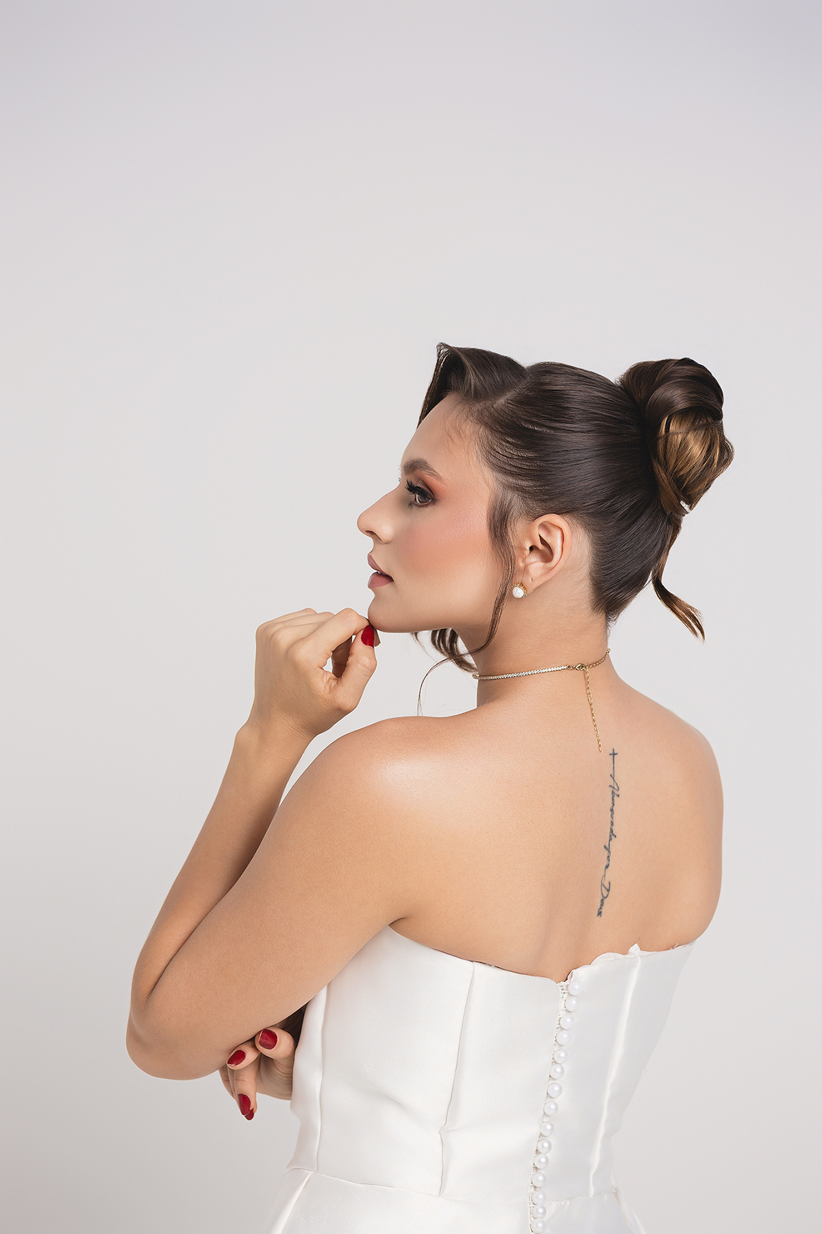 A ênfase na nuca e nos ombros foi garantida pelo trabalho impecável da cabeleireira Priscilla Martins. O coque alto, extremamente polido, traz um ar de "realeza moderna". A escolha de deixar uma mecha frontal ondulada emoldurando o rosto quebra a rigidez do penteado, adicionando leveza e um toque de charme contemporâneo.