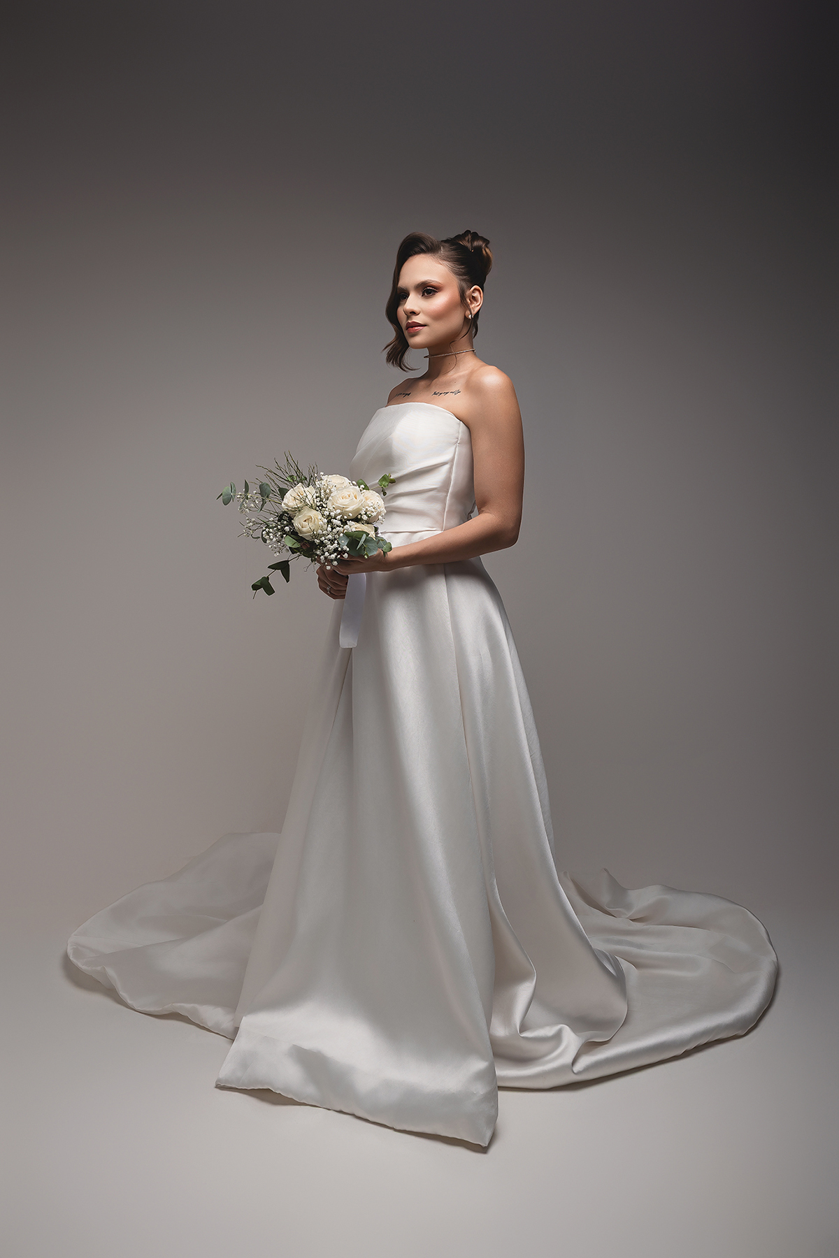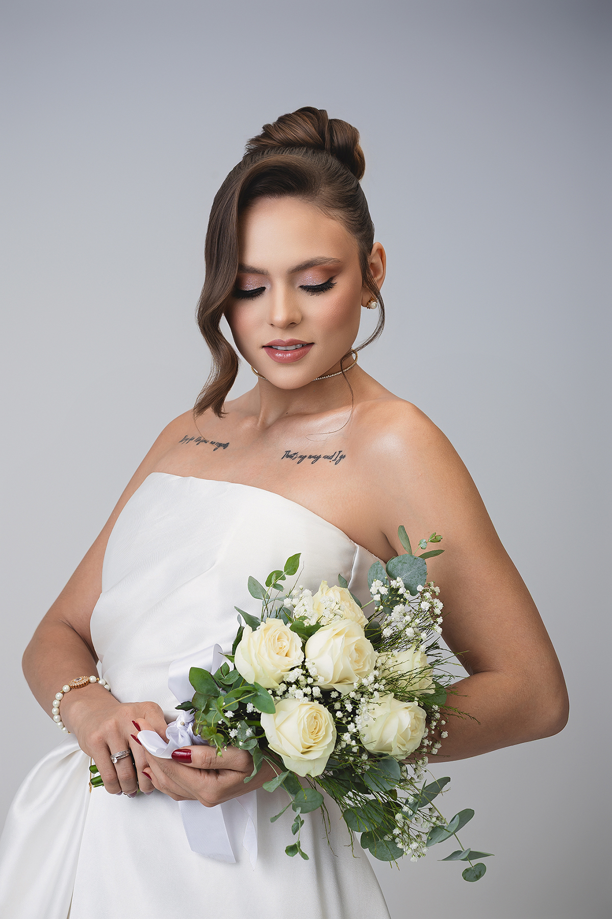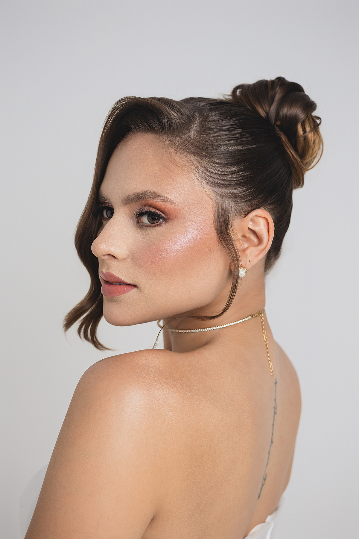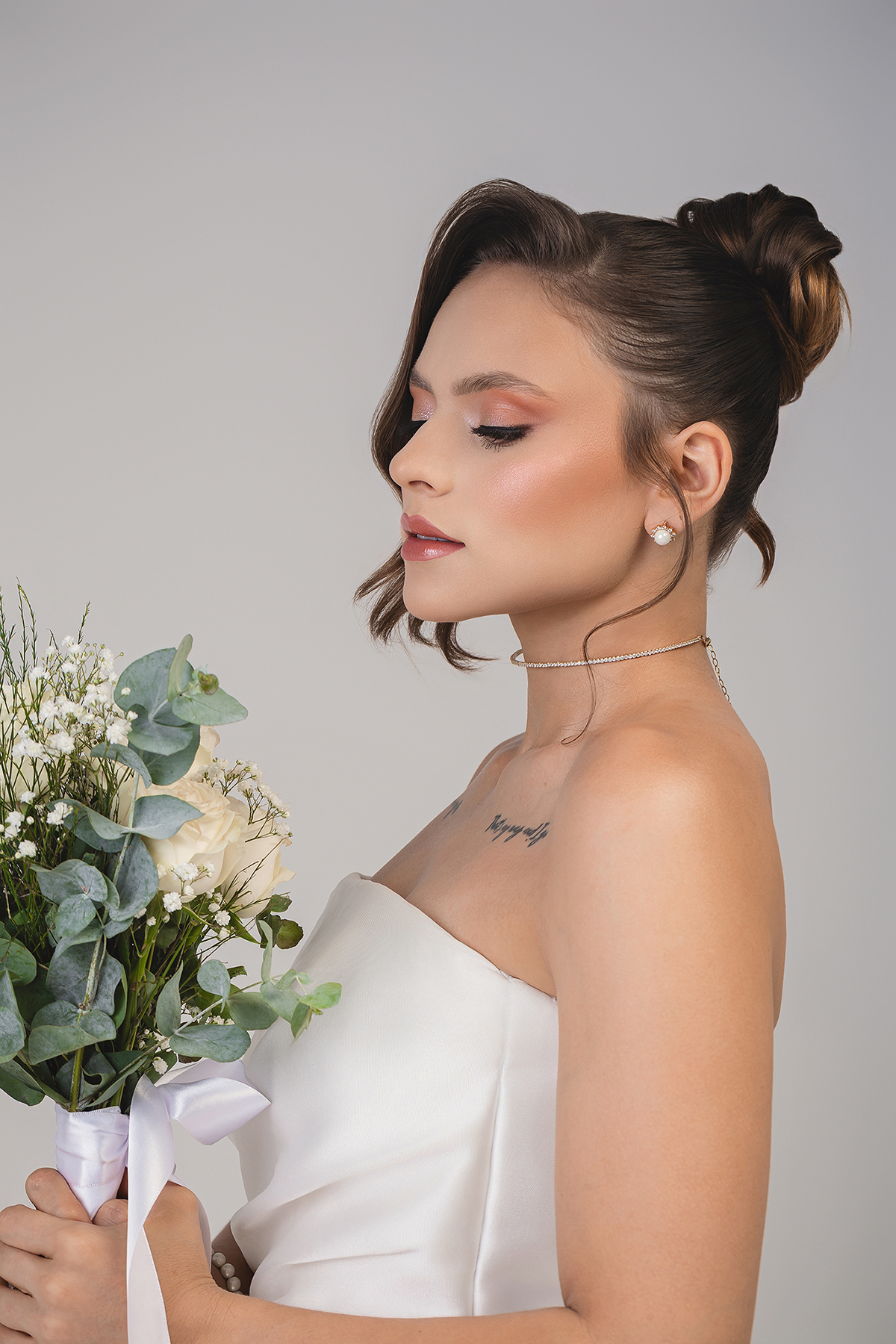 2. O High-Key Sofisticado: No fundo claro, a luz é suave e envolvente, perfeita para destacar os detalhes da maquiagem e os acessórios, como o delicado buquê da Turu Turu Presentes.