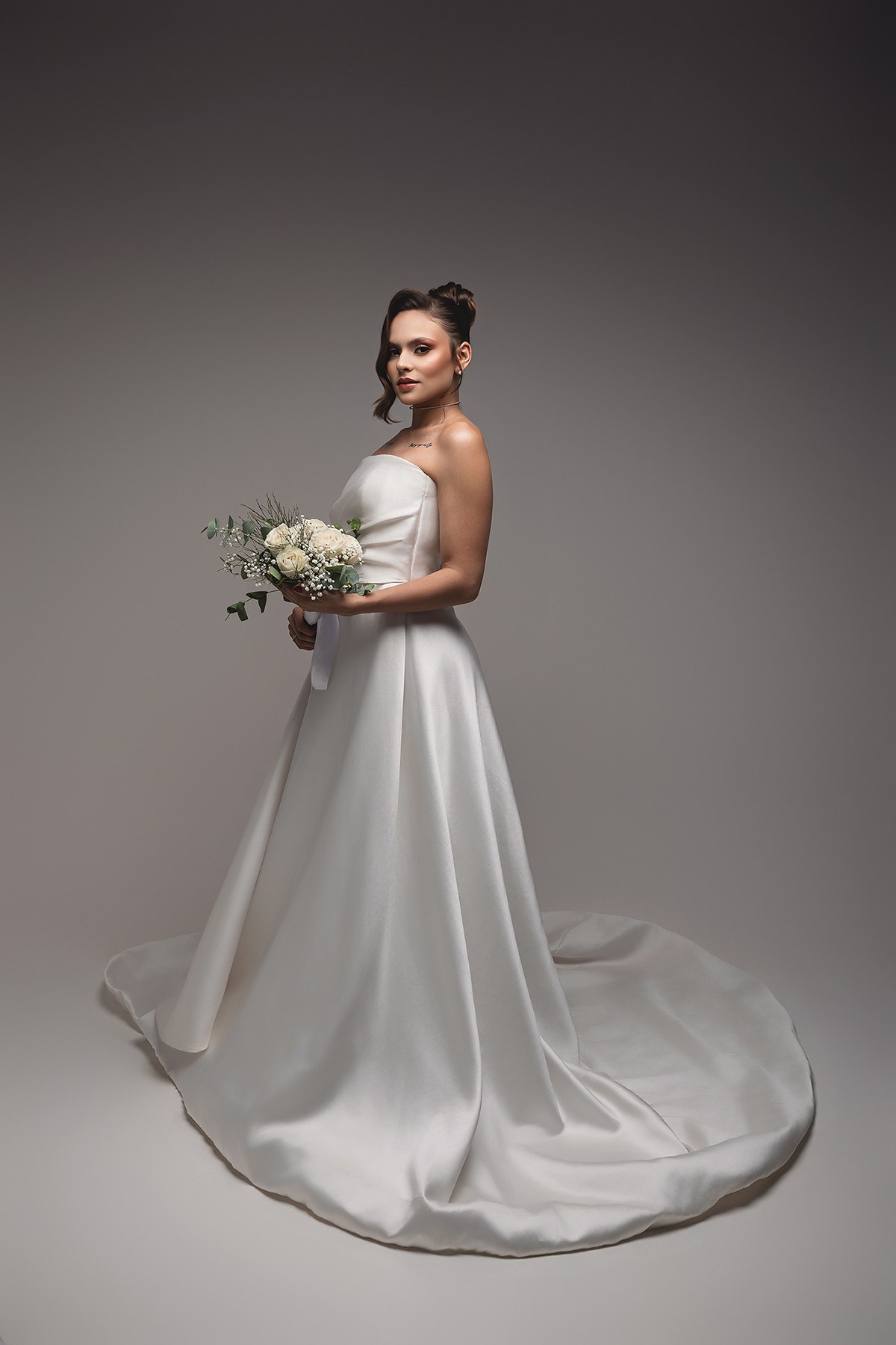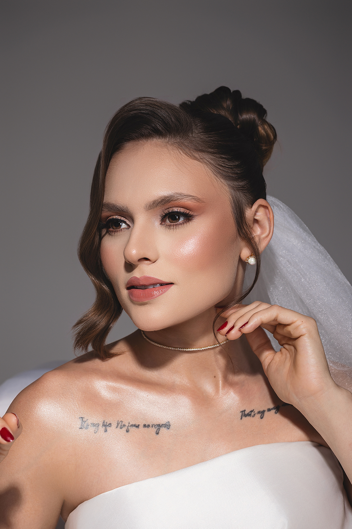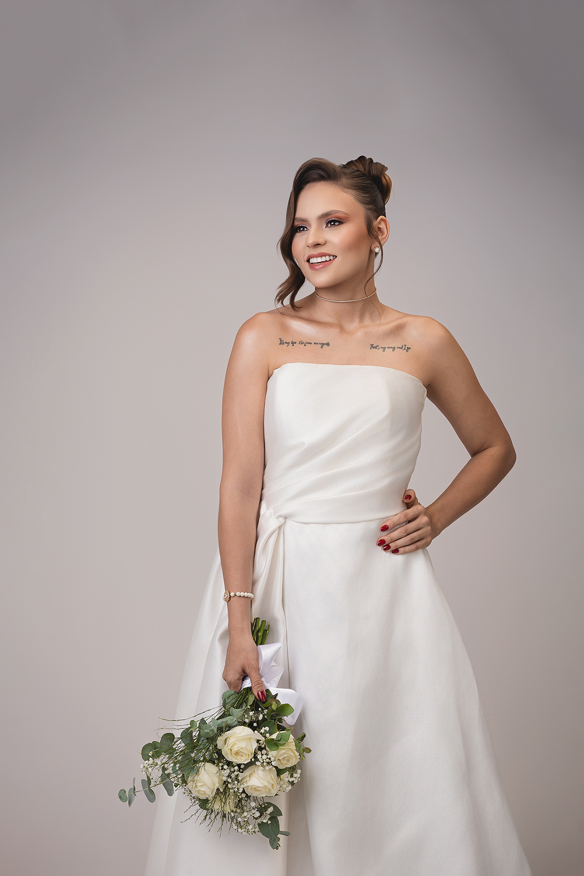 2. O High-Key Sofisticado: No fundo claro, a luz é suave e envolvente, perfeita para destacar os detalhes da maquiagem e os acessórios, como o delicado buquê da Turu Turu Presentes.