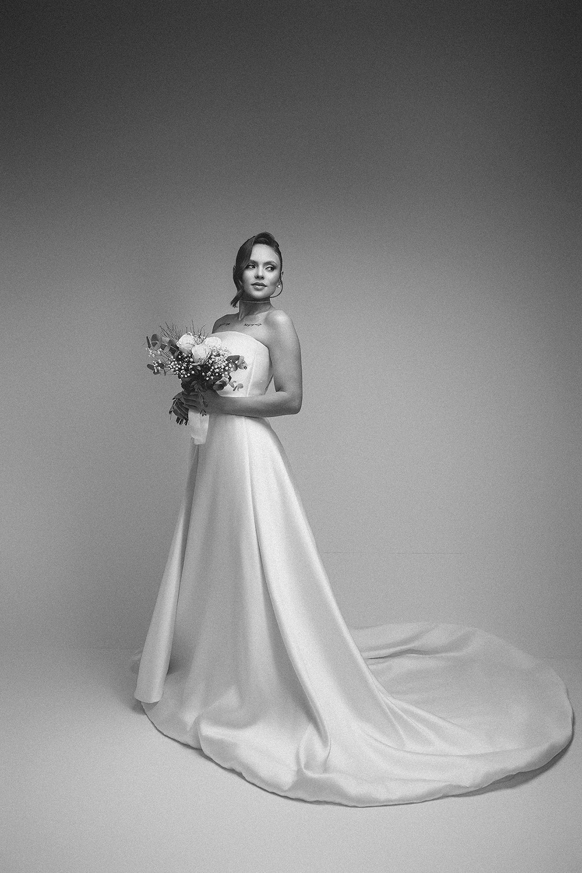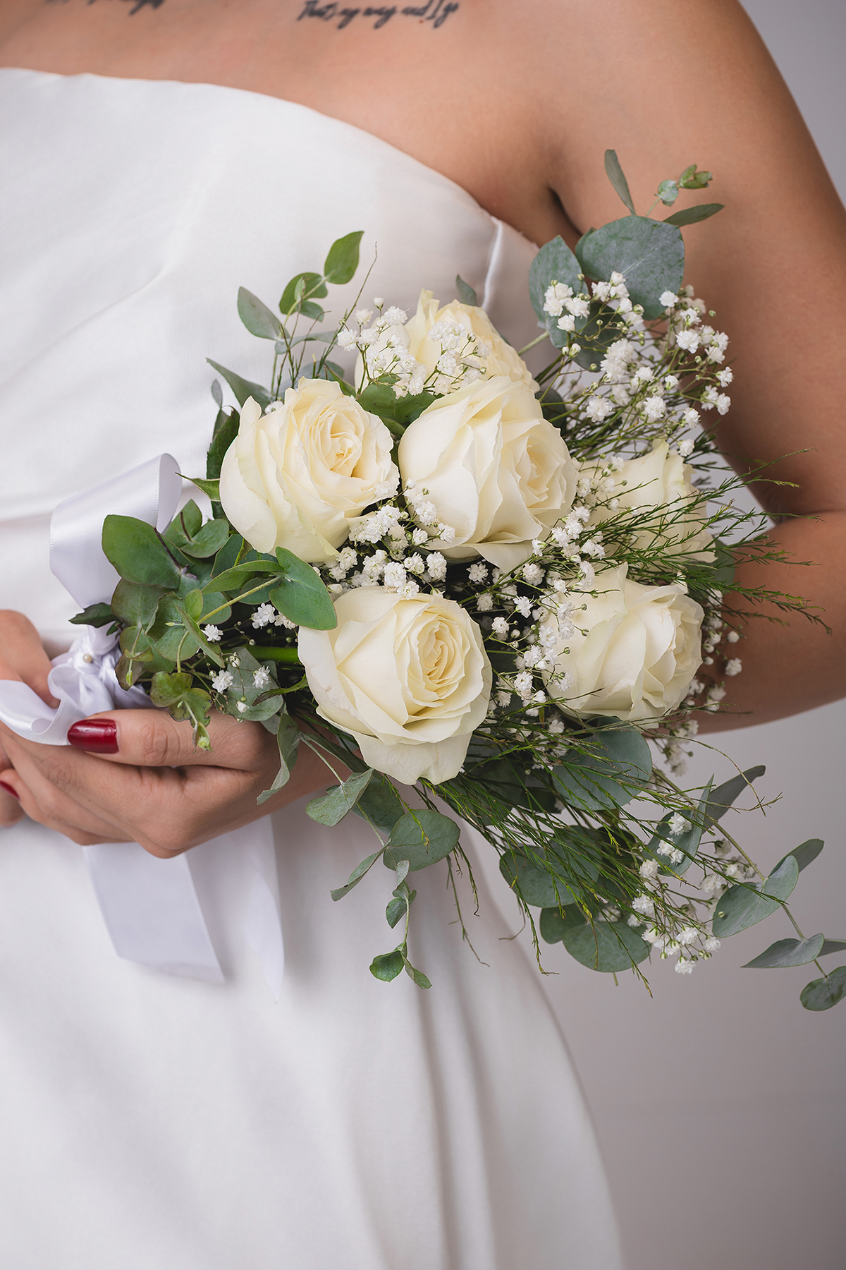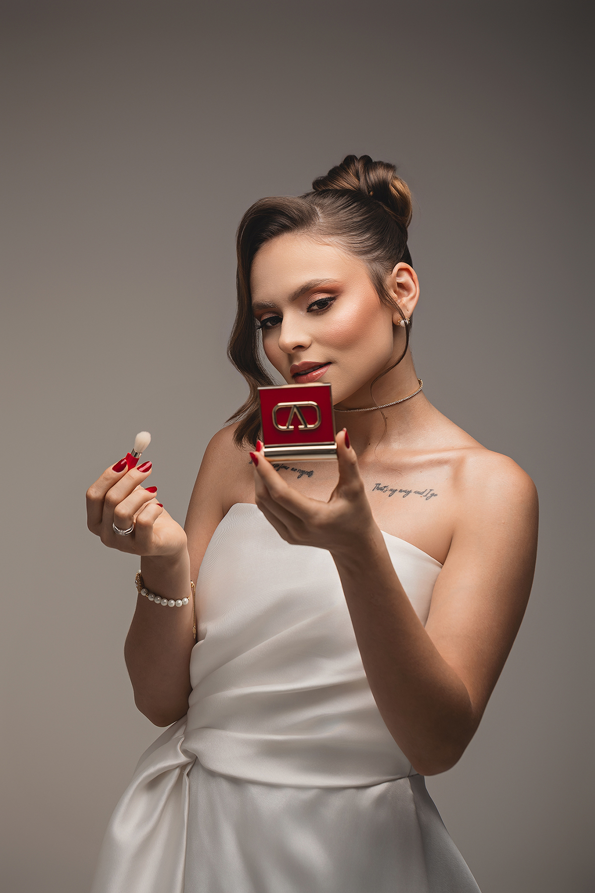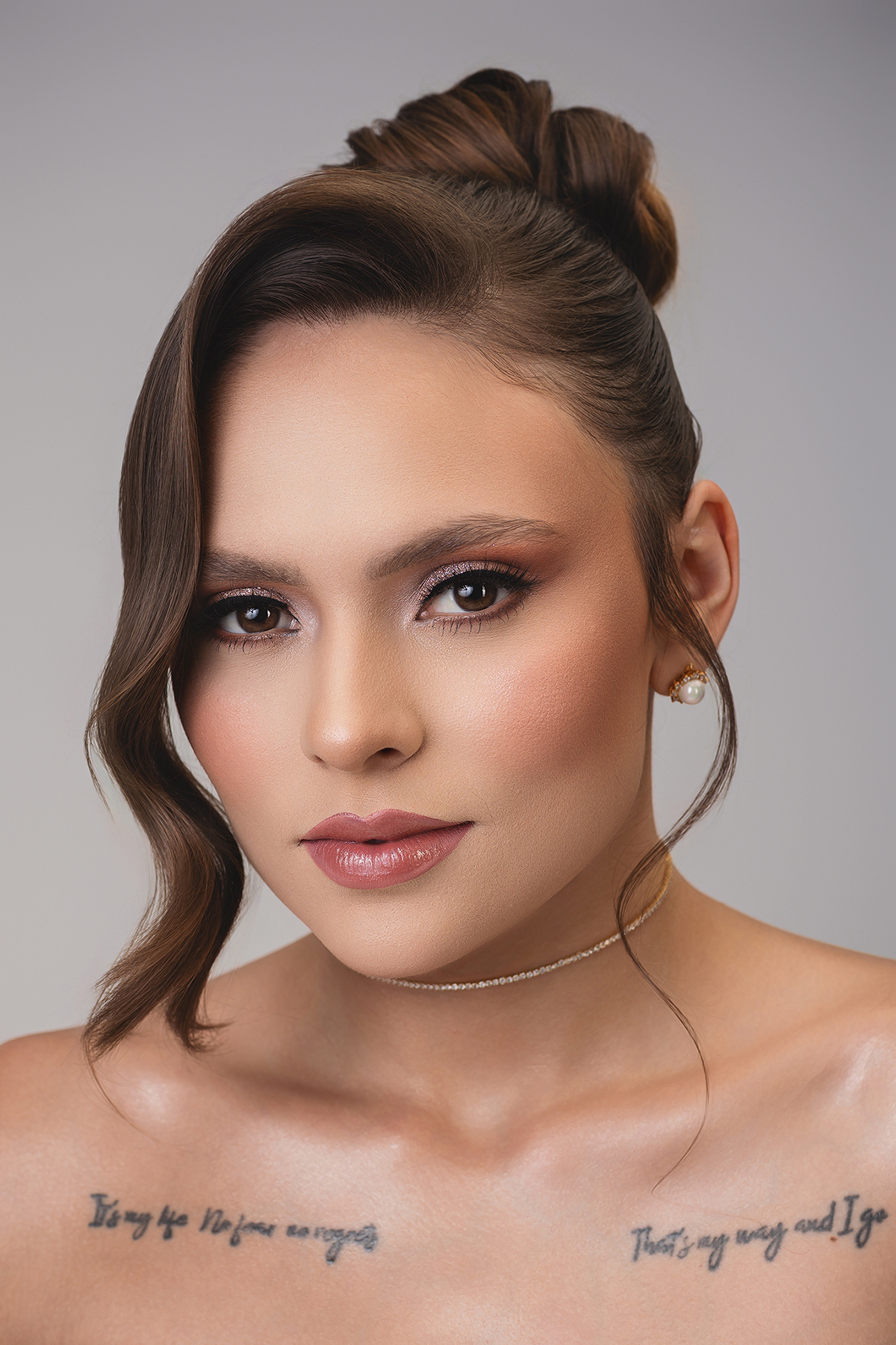 2. O High-Key Sofisticado: No fundo claro, a luz é suave e envolvente, perfeita para destacar os detalhes da maquiagem e os acessórios, como o delicado buquê da Turu Turu Presentes.