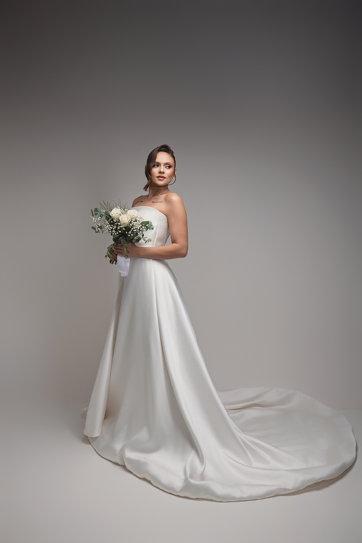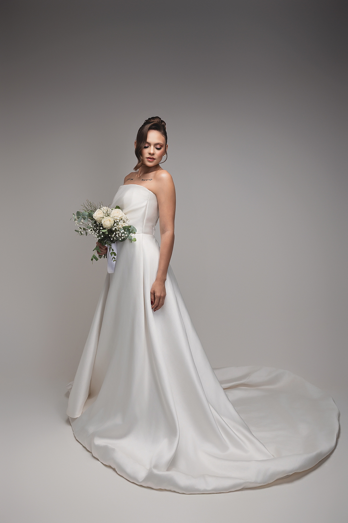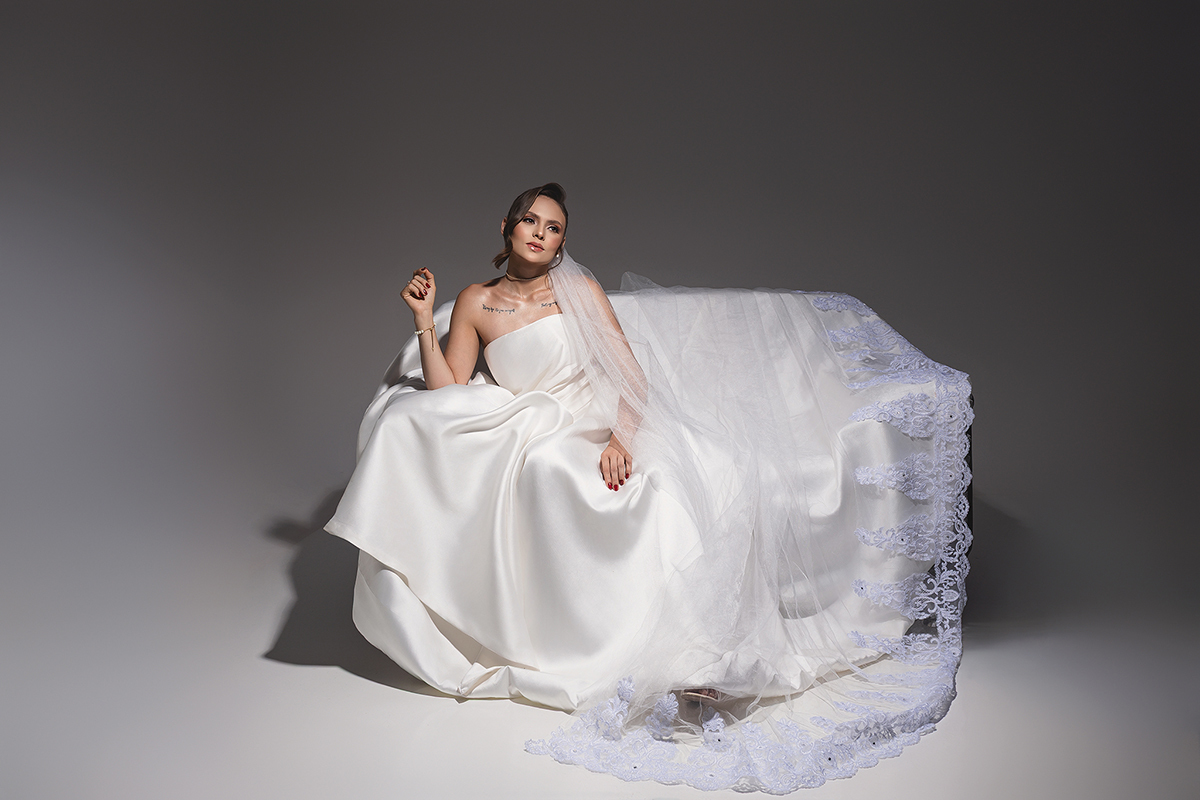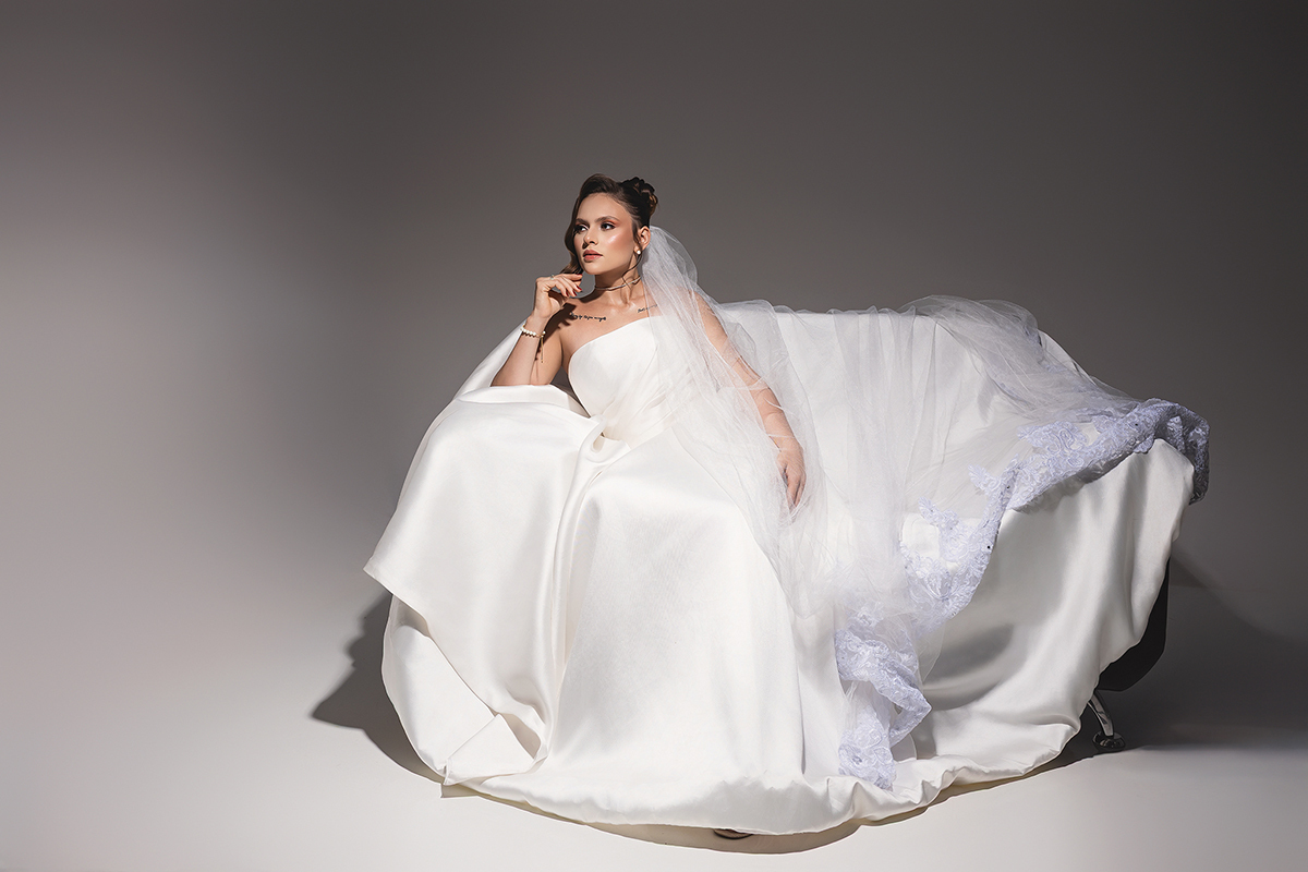 Cedido pela Queiroz Noivas, o modelo escolhido é a definição de "menos é mais". O vestido tomara-que-caia em cetim estruturado traz um brilho sutil e uma modelagem que valoriza a silhueta com elegância. O destaque fica para o drapeado suave no busto e a saia volumosa com cauda, que ganha um toque de romantismo clássico quando harmonizada com o véu em renda bordada.
