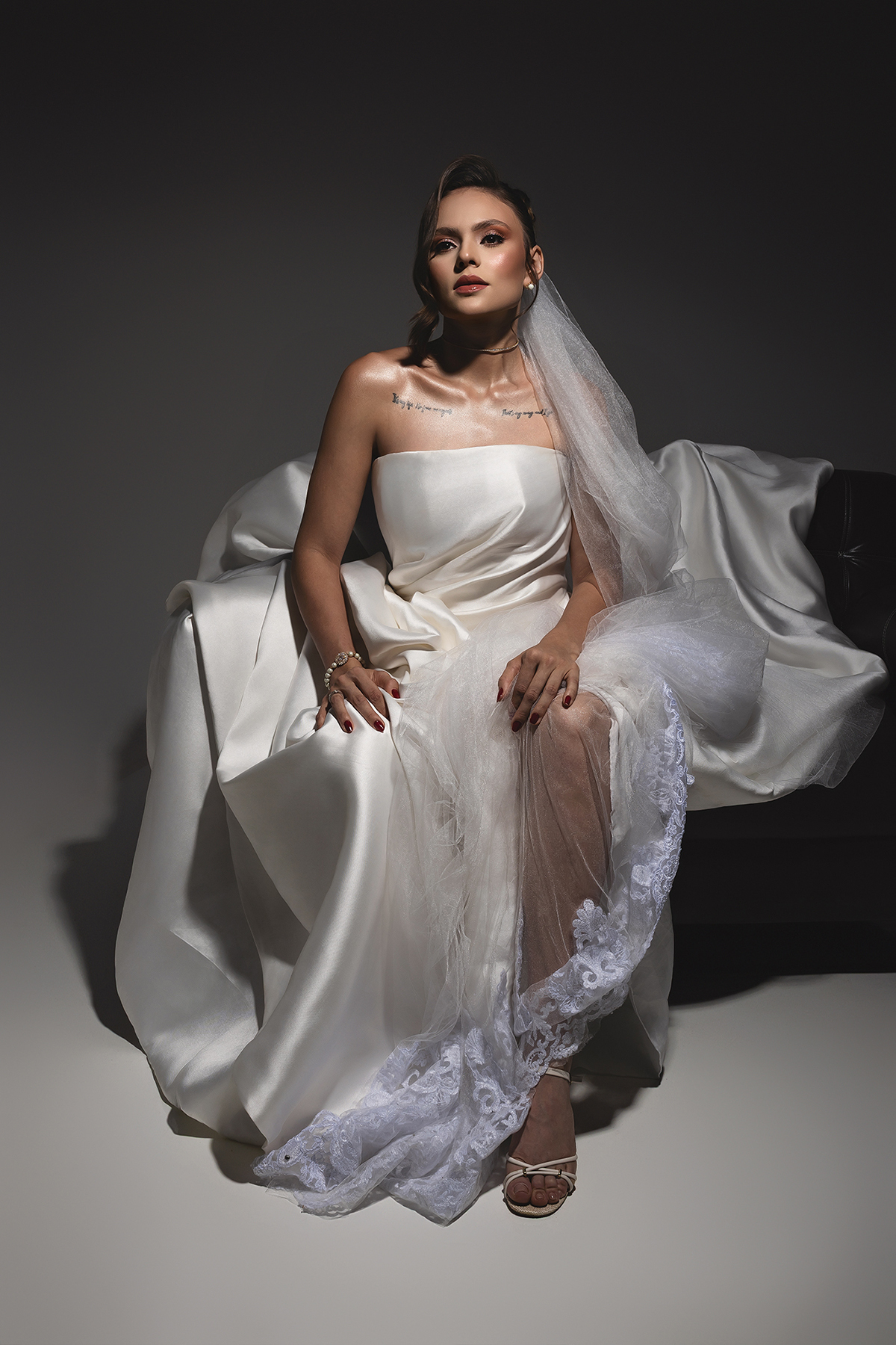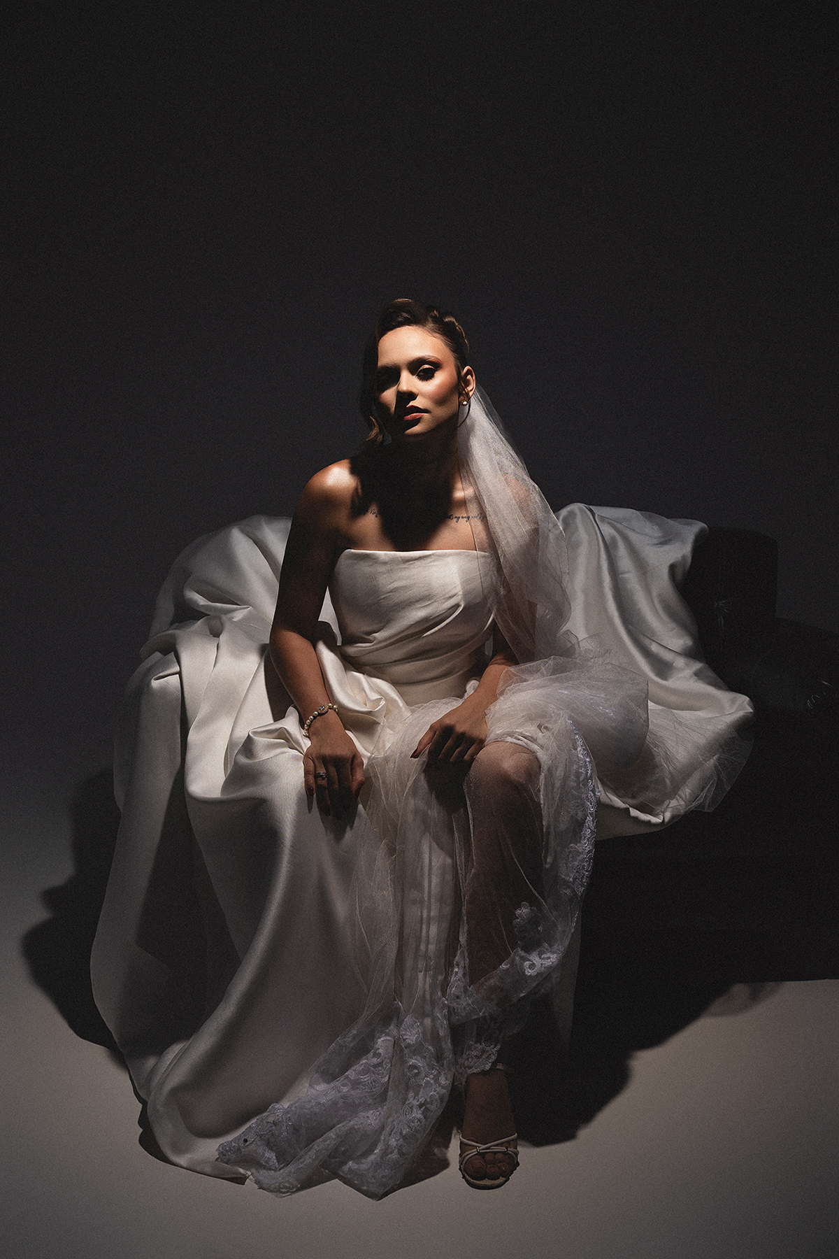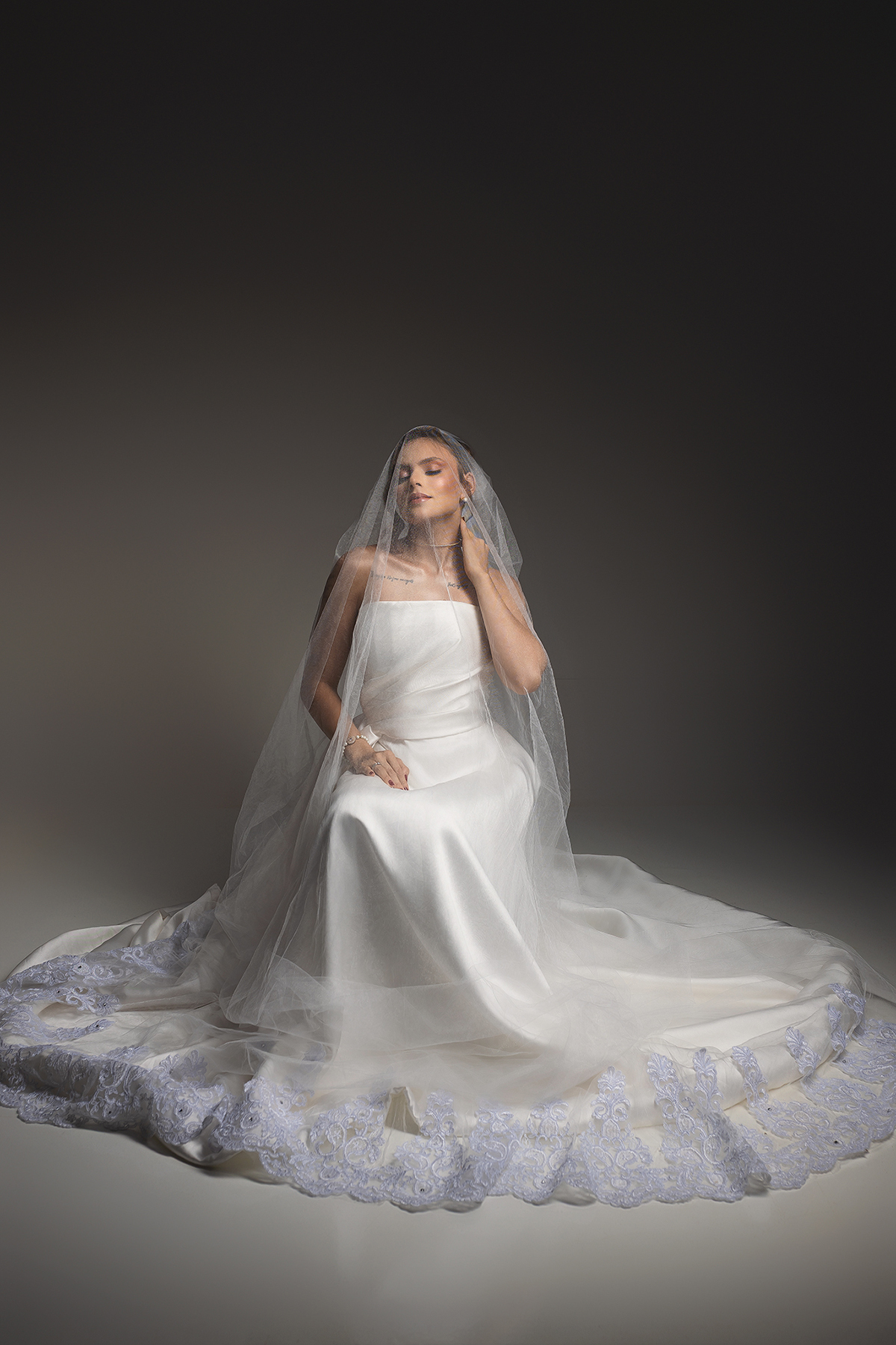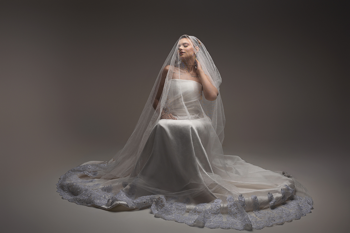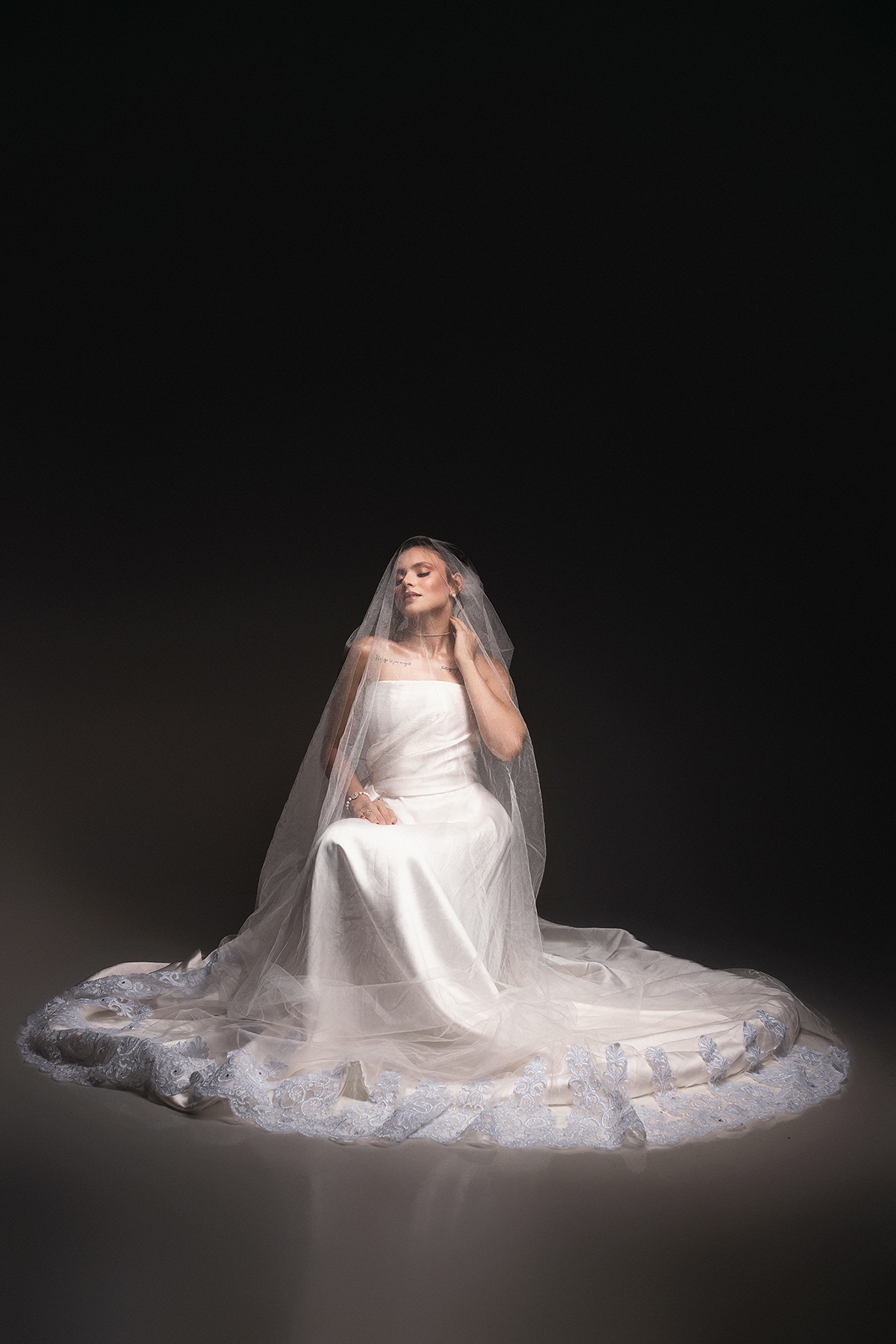 1. O Drama do Fundo Escuro: Uma luz zenital (vinda de cima) que isola a noiva, criando um efeito místico e destacando a textura do véu e a pureza do branco.