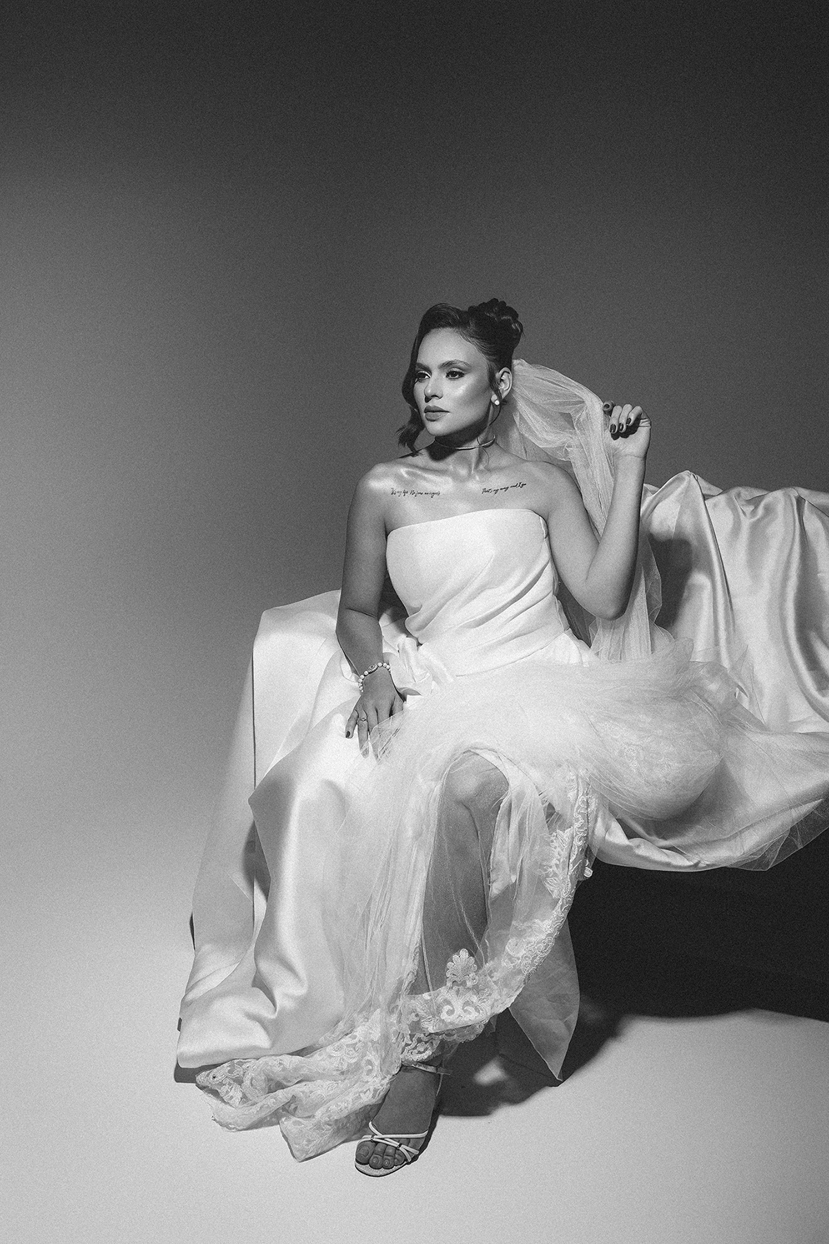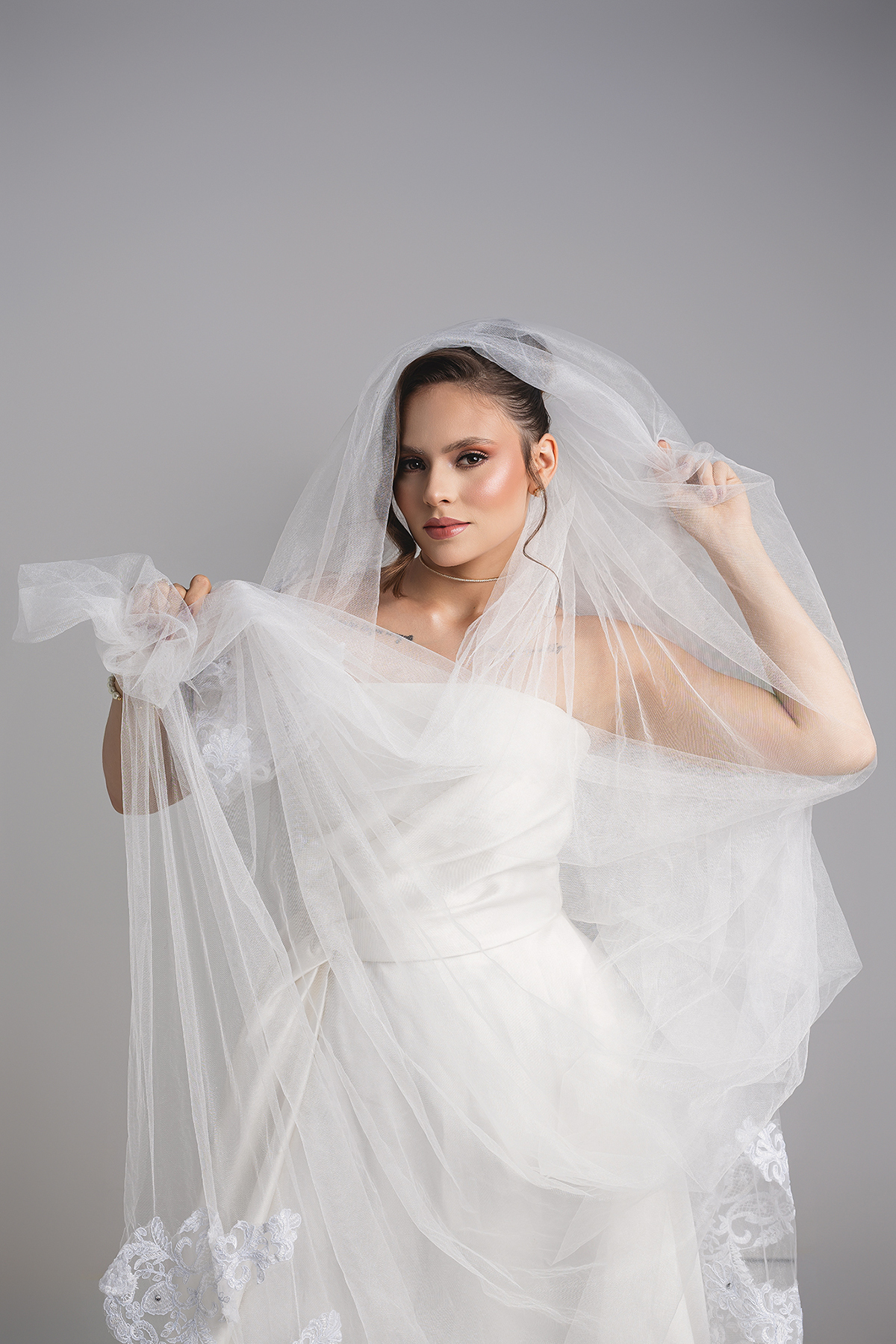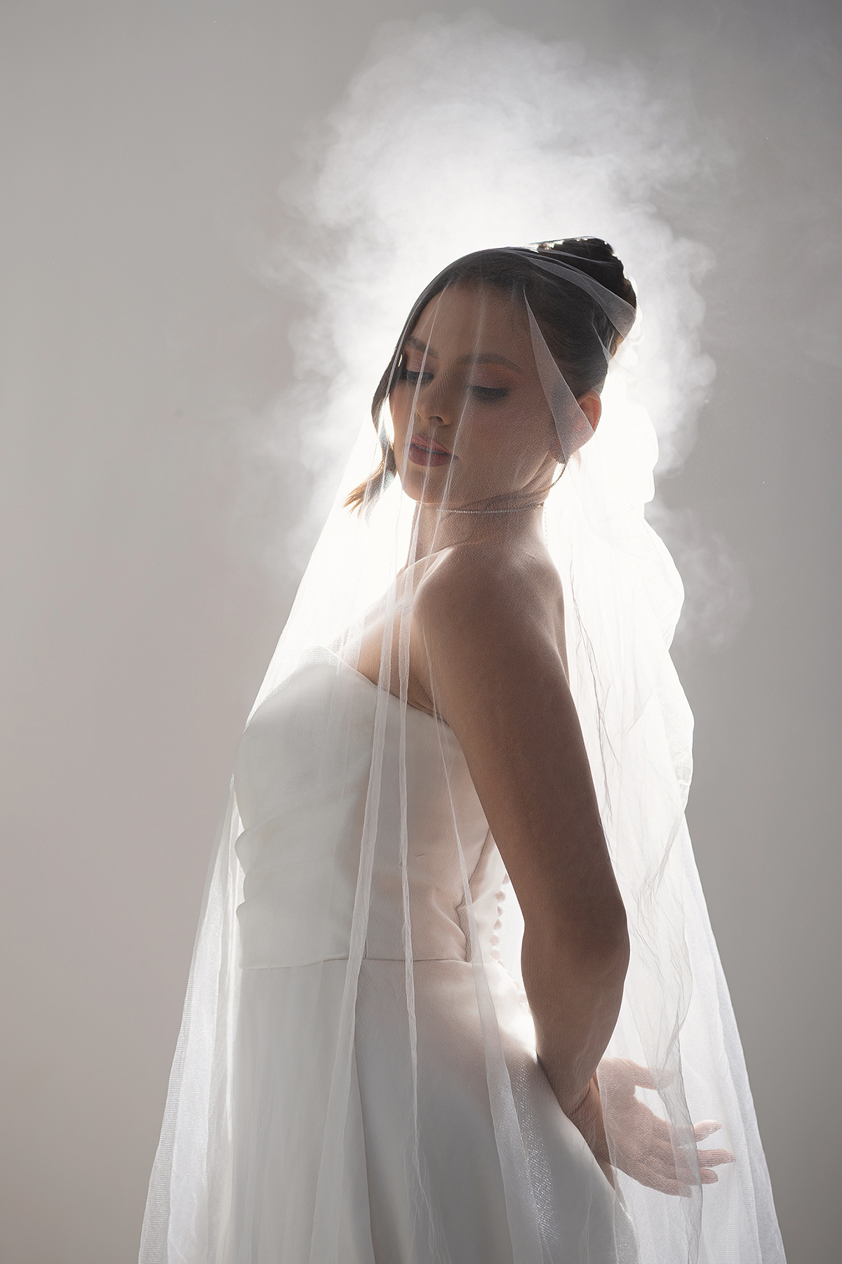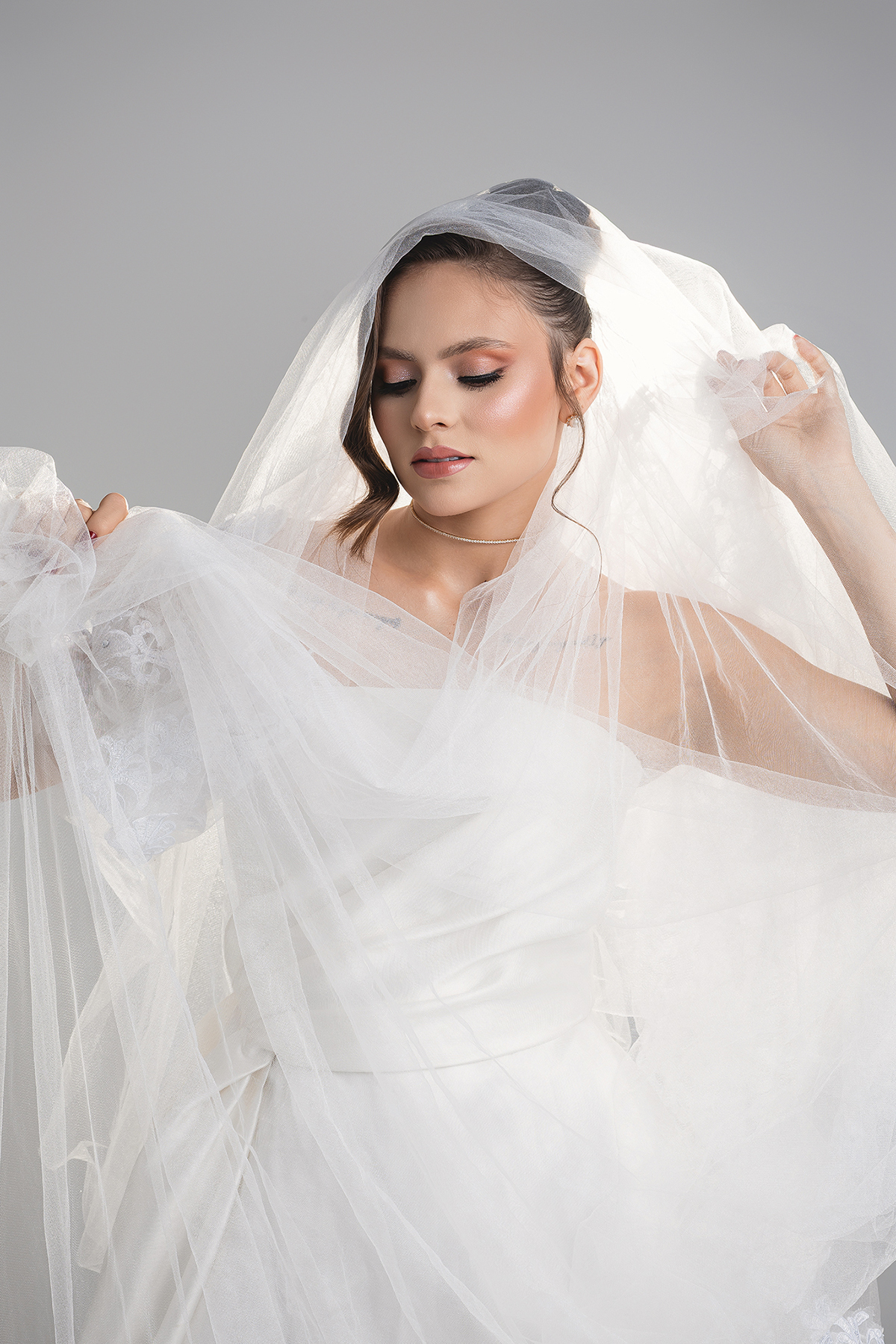 1. O Drama do Fundo Escuro: Uma luz zenital (vinda de cima) que isola a noiva, criando um efeito místico e destacando a textura do véu e a pureza do branco.