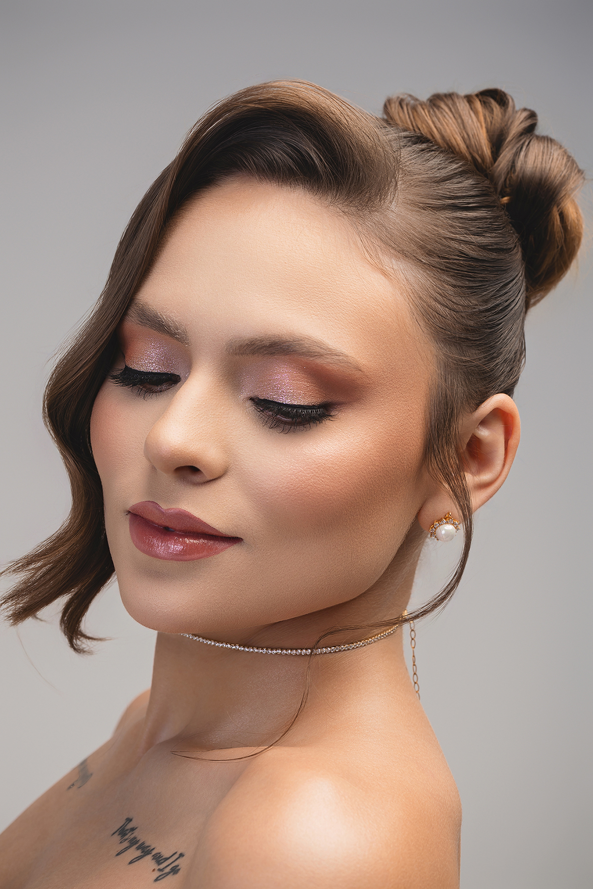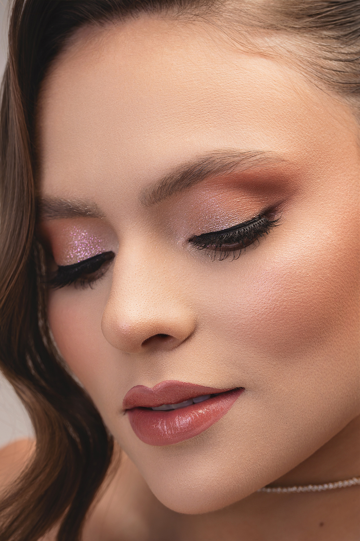 - Olhos: Uma transição perfeita de tons terrosos com um toque de brilho rose/perolado nas pálpebras, garantindo profundidade e um olhar marcante, mas suave.